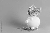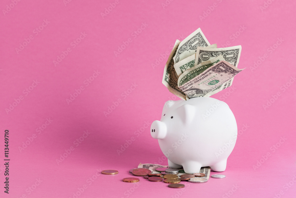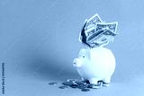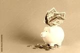 Huge savings in the piggy bank, overflowing with cash