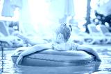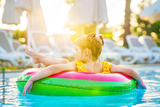 Happy little girl with inflatable toy ring float in swimming pool. Little preschool child learning to swim and dive in outdoor pool of hotel resort. Healthy sport activity and fun for children.