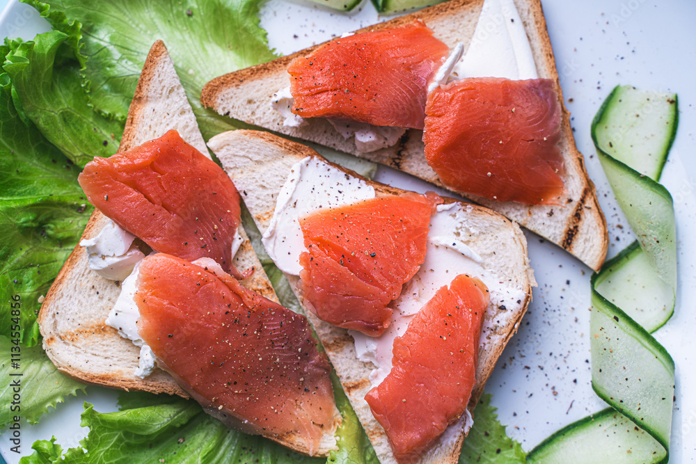 Sandwiches with cottage cheese and slices of salted trout on a white plate with cucumber and herbs