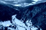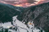 Glowing lights from cozy lodges illuminate the snow-covered valley as twilight descends over the majestic mountains of Piatra Craiului. Nature's tranquility captivates the viewer