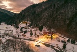 As dusk settles over the snowy terrain, quaint homes and lodges nestled in Piatra Craiului come alive with warm lights, creating a picturesque winter wonderland. Snow-laden trees stand sentinel