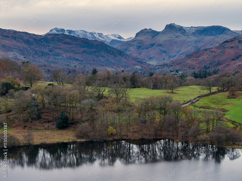 Dramatic aerial drone landscape imsge of Loughrigg Tarn in Autumn in Lake District