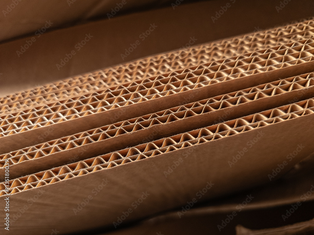 Close-up view of stacked corrugated cardboard layers, showcasing the intricate wave structure and texture, ideal for concepts like packaging, recycling, industry, and material design