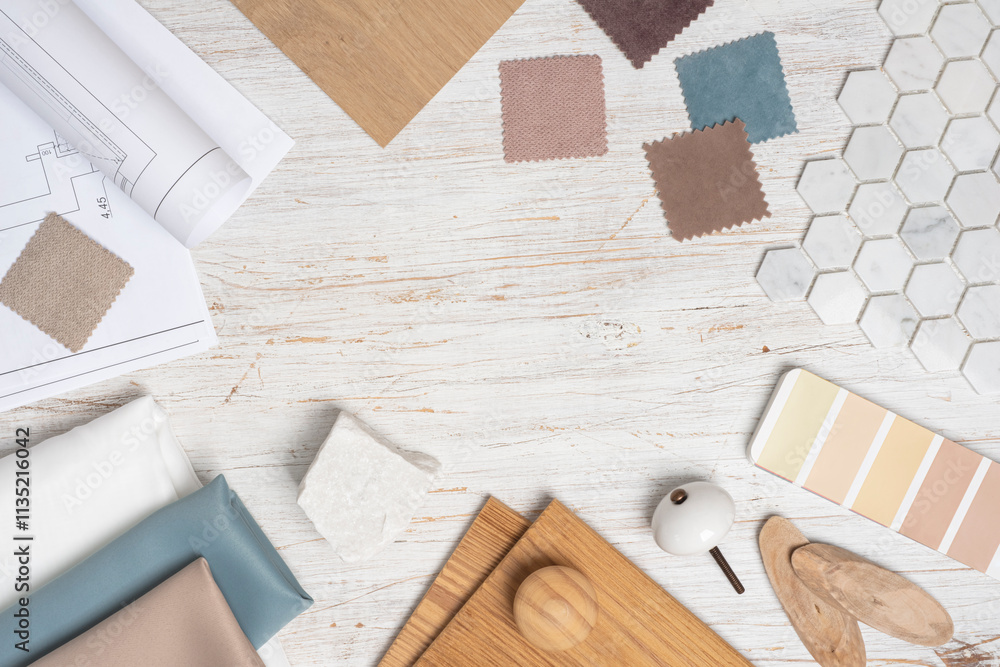 Top view of creative desk with modern house material samples and copy space