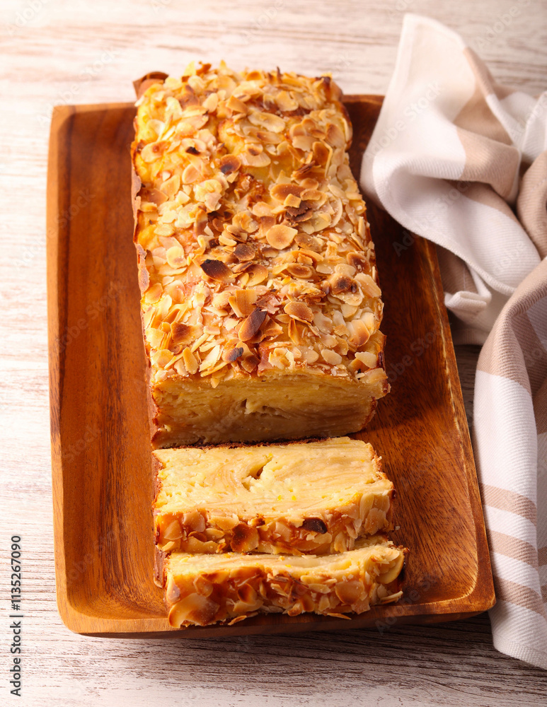 Invisible apple cake, sliced, sweet apple bread with almond topping