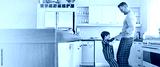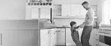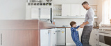 Dance, happy and dad with child in kitchen for bonding, fun relationship and playful in morning. Family banner, dancer and father with son with music, learning and teaching moves together in home