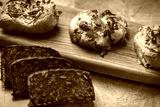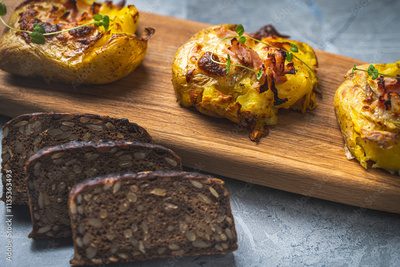 Baked potatoes with cheese and bacon crushed on a wooden board on a gray table with a rye bread.