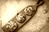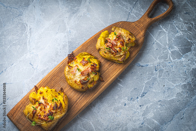 Baked potatoes with cheese and bacon crushed on a wooden board on a gray table.