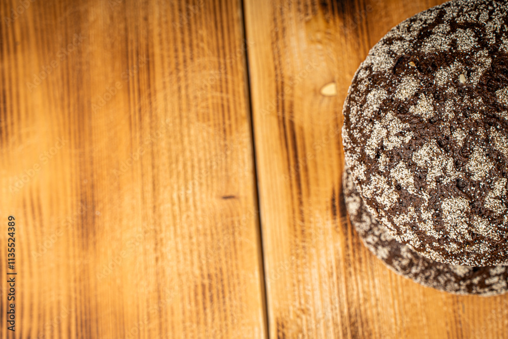 Round wheat bread and small rye bread rolls on a wooden background. Space for text. High quality photo