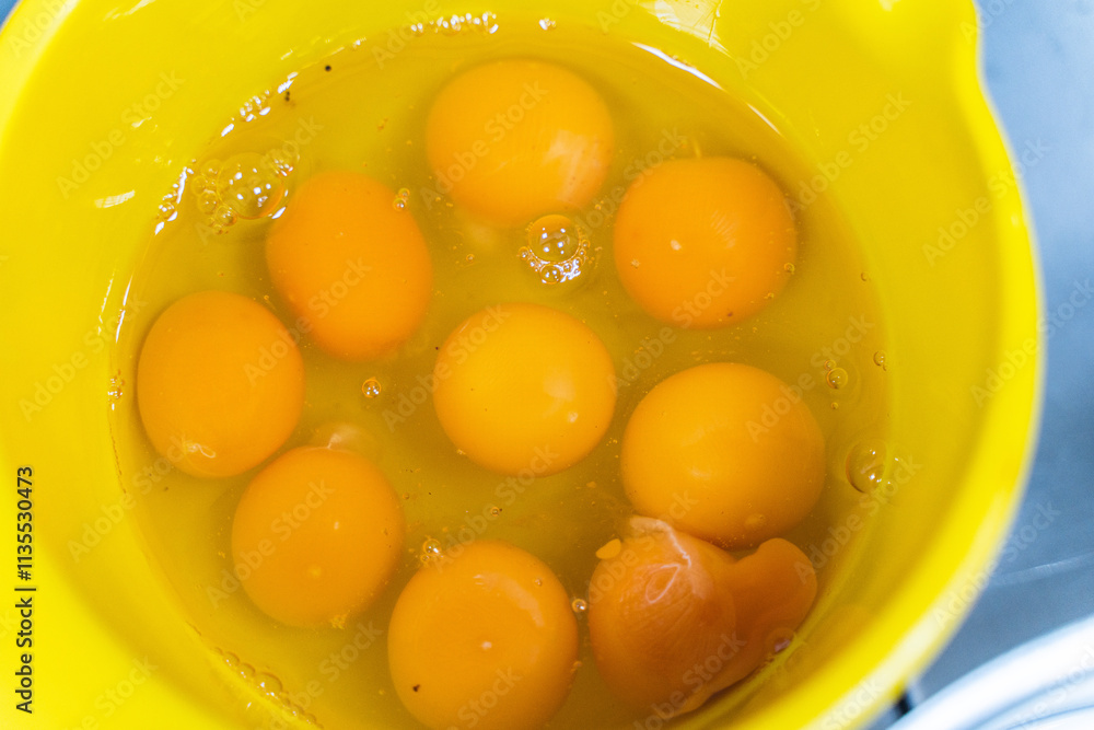 Egg yolks and whites in a yellow bowl. Lots of broken eggs in a bowl. High quality photo