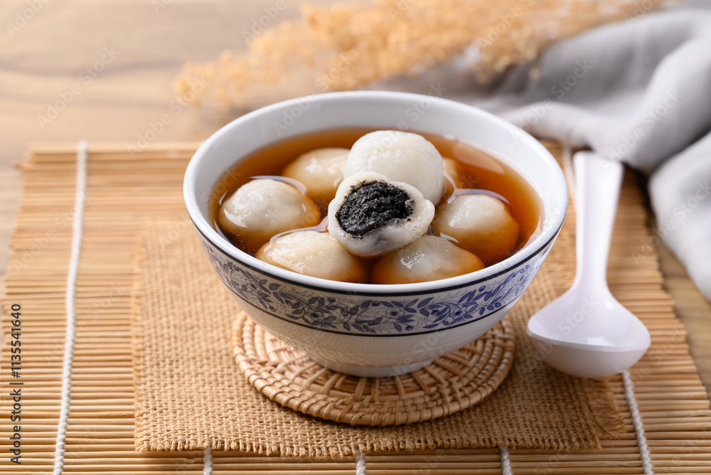 Tangyuan (Chinese sweet dumpling), Glutinous rice flour filling with black sesame in ginger syrup