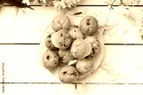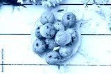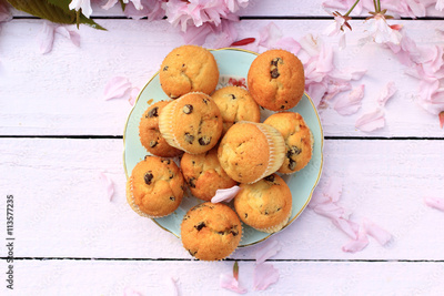 Delicious Scottish, muffins on a wooden pink table, fresh breakfast in the Spring garden
