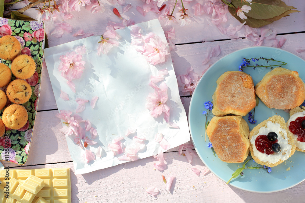 Romantic fresh breakfast with scottish scones and white chocolate in the garden