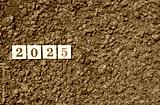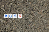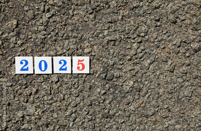 Numbers of 2025 year. Paper square numbers on the stone road background, that means coming New Year Eve. Christmas, holidays, celebration concept. New Year of 2025, year of green wooden snake