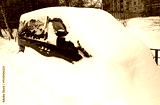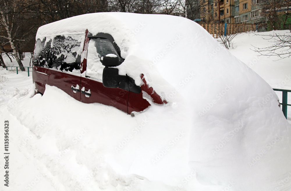 Snowy winter and snow-covered vehicles. Snowy car view covered in a huge snowdrift. Abnormal weather in winter. Ice Age in the city. Snow-covered streets and yards after snowfall. Winter in big town