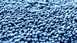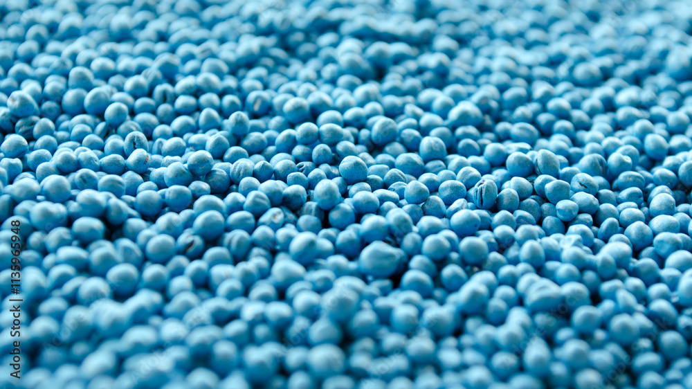 Treated rapeseed with blue coating, background, texture, top view. Encrusted rapeseed ready for sowing. Background of treated rapeseed, blue color, texture, top view.