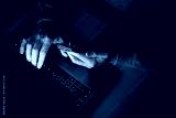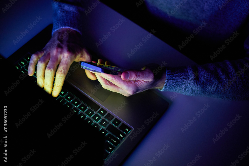 Male hands are using calculator on mobile phone and laptop keyboard.