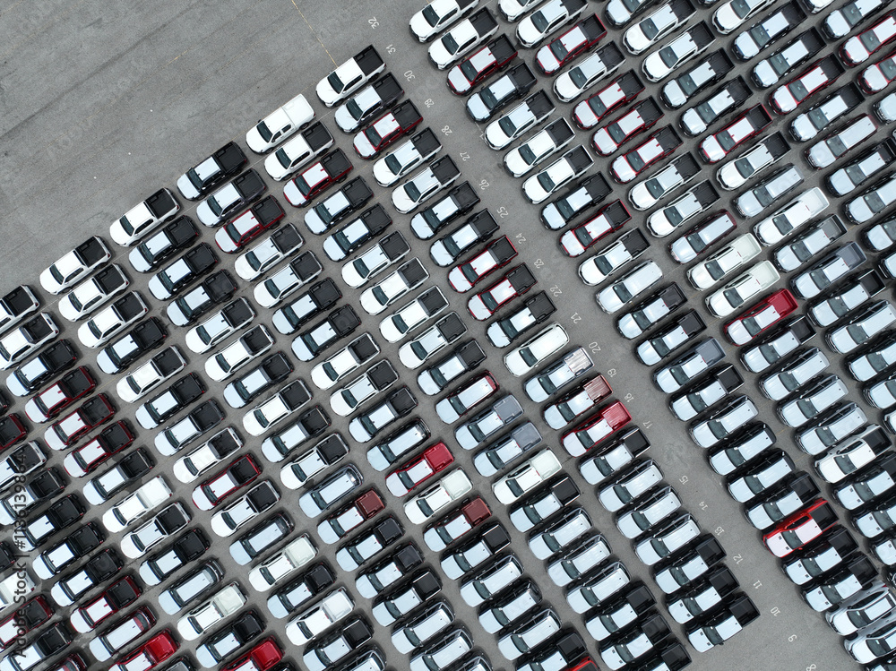Aerial view of new cars stock at factory parking lot. Above view cars parked in a row. Automotive industry. Logistics business. Import or export new cars at warehouse. Big parking lot at port terminal