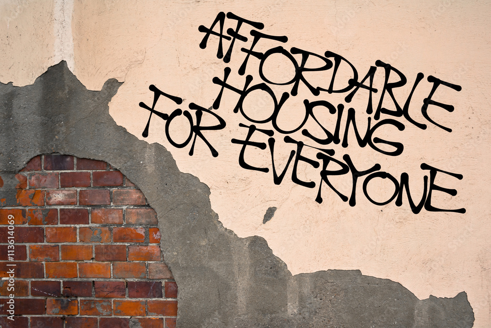 Affordable Housing For Everyone - handwritten graffiti sprayed on the wall, anarchist aesthetics. Appeal to provide social housing for poor people. Prevention against homelessness