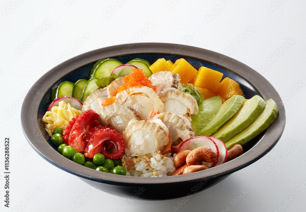 Delicious seafood poke rice isolated on white background