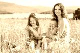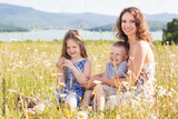 Mother,girl and boy in chamomile field