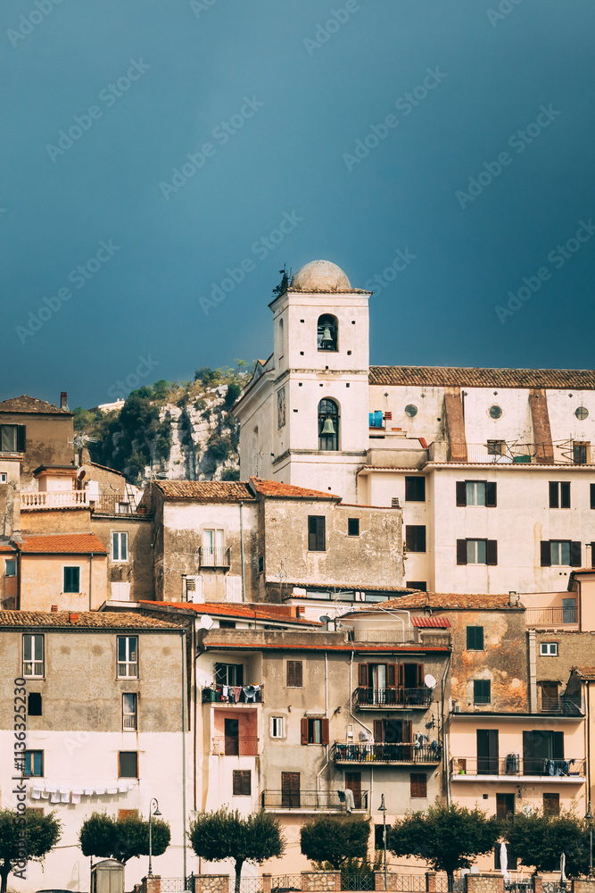 Monte San Biagio, Italy. Top View Of Residential Area. Cityscape In Autumn Day Under Blue Sky