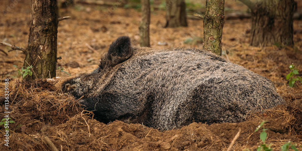 Belarus. Wild Boar Or Sus Scrofa, Also Known As The Wild Swine, Eurasian Wild Pig Resting Sleeping In Autumn Forest