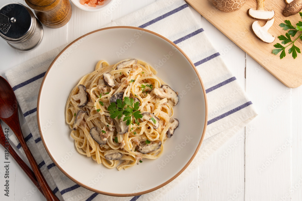 Spaghetti with creamy mushroom sauce,Pasta Linguine with mushrooms and parsley in white plate.Italian traditional dish.Top view.
