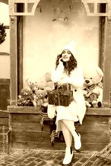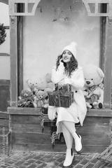 A girl in a fur coat throws Christmas balls to decorate the Christmas tree.