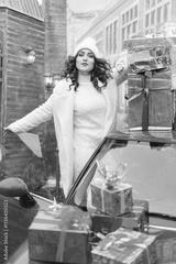 A woman in a white fur coat and a beautiful hairstyle stands in a car dealership, near a red car.