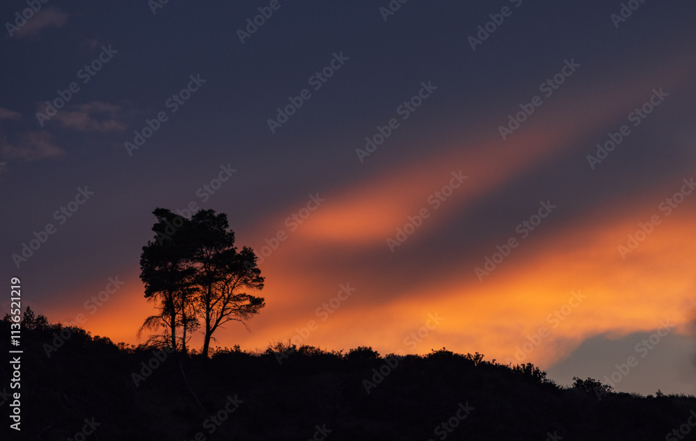 A breathtaking view of a vibrant sunset sky with dramatic cloud formations, silhouetted trees, and distant hills, evoking a sense of tranquillity and awe.