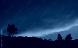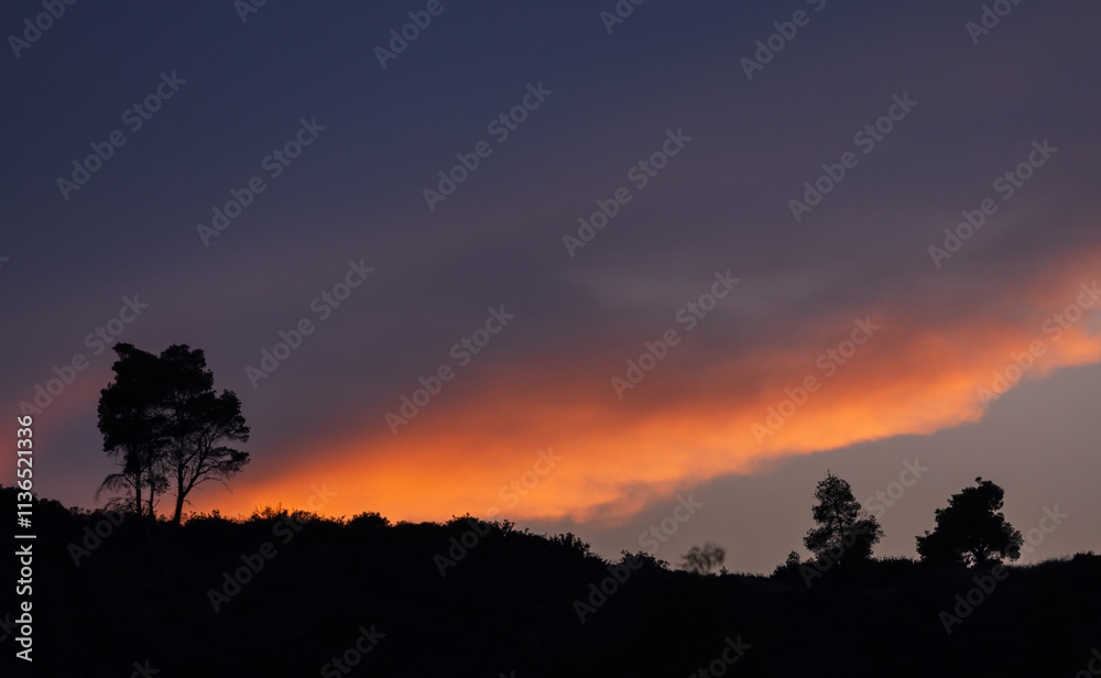 A breathtaking view of a vibrant sunset sky with dramatic cloud formations, silhouetted trees, and distant hills, evoking a sense of tranquillity and awe.