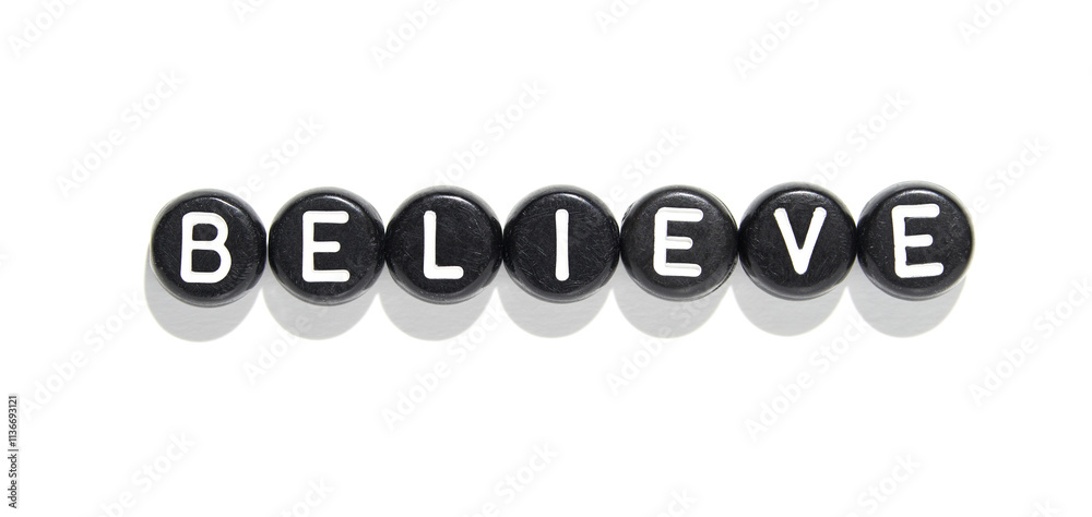 Believe conceptual word arrangement with black beads and white letters isolated on white background