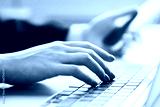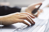 Picture focuses on a woman's hands typing on a contemporary laptop keyboard, office setting appearing blurred