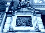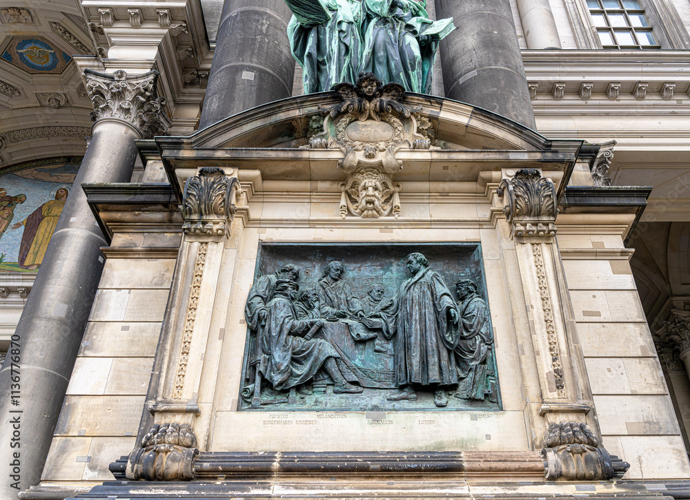 Evangekische Bildnisse und Reliefs an der Fassade des Berlioner Dom, Berline, Deutschland
