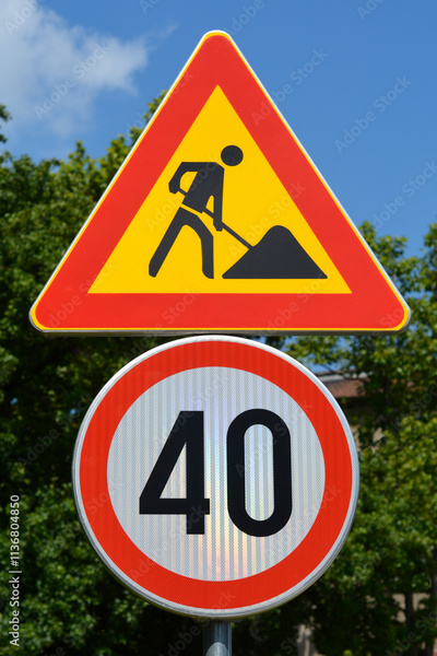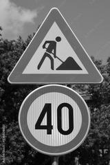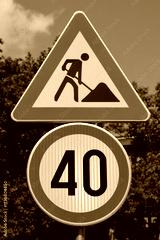 Two traffic signs, one indicating roadworks and the other showing a speed limit of 40 km/h