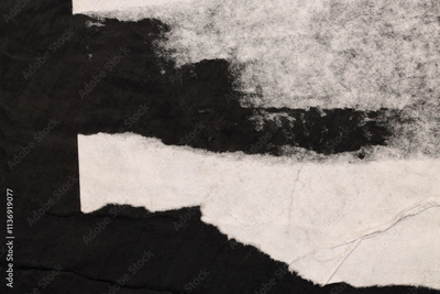 Torn, ripped paper pieces wave crack collage. Black and white grunge copy space texture stain background.