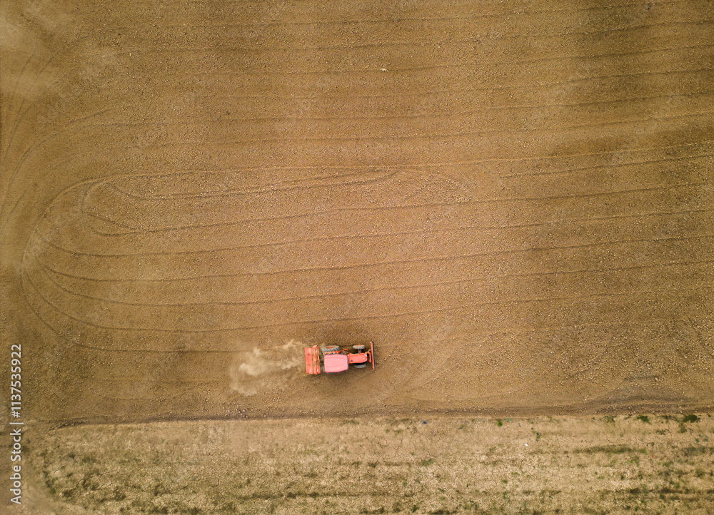 Aerial photography of a medium-sized orange tractor is plowing the agricultural field to prepare for planting.