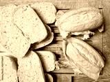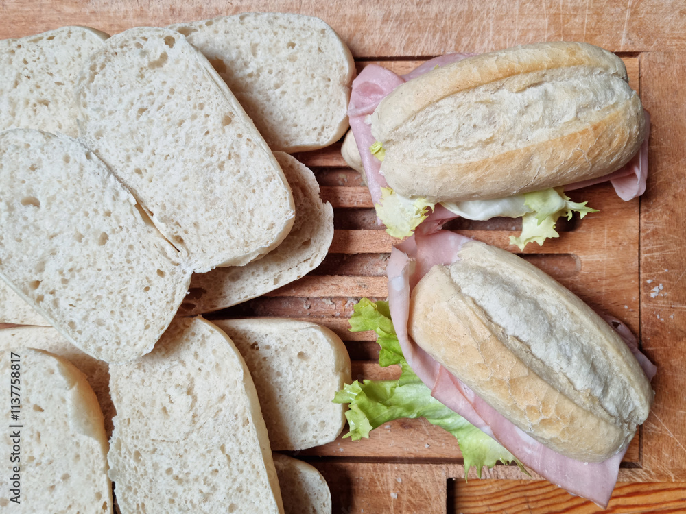 Preparing sandwiches with mortadella and lettuce (sandwiches and sliced rolls on a wooden cutting board)