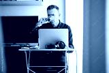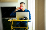 45 year old man drinking a cup of coffee while teleworking on laptop