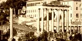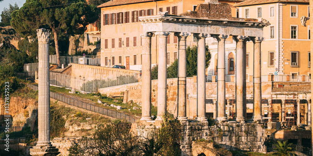 Rome, Italy. Column Of Phocas And The Temple Of Saturn. Colonna Di Foca And Tempio Di Saturno. The Historic Centre Of Rome Is A UNESCO World Heritage Site