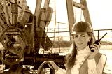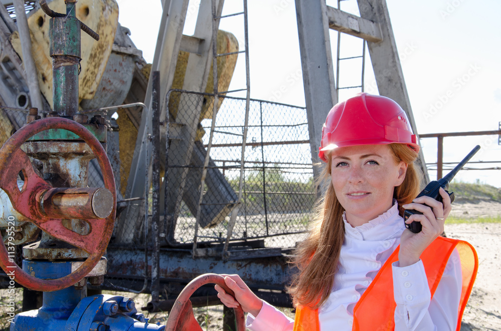 Beautiful woman engineer near well head valve in the oil field talking on the radio wearing red helmet and work clothes. Pump jack background. Oil and gas concept.