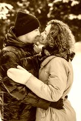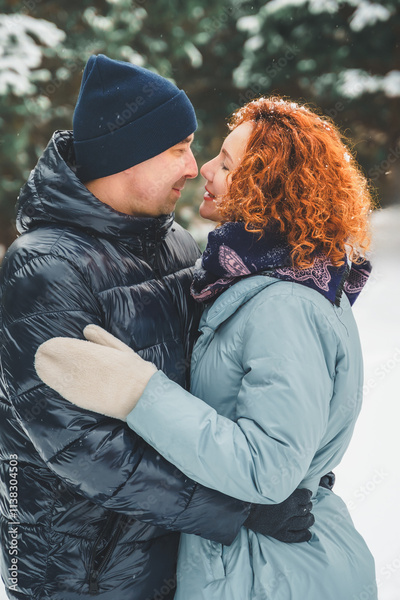 Love romantic love story. Happy couple of middle aged millennials, bright red-haired woman in winter snow park. Romantic date, kissing, hugging. Walking, having fun. Stylish blue clothes, jacket, hat
