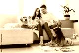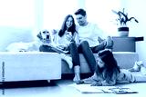 Family enjoying time together at home, parents using smartphone and daughter drawing