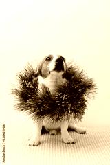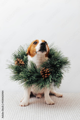 Funny Jack Russell Terrier dog wearing big green holiday wreath on a white background