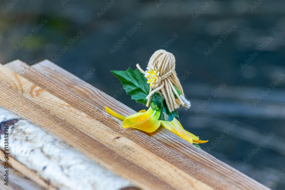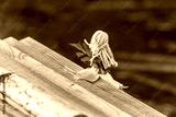 a homemade toy fairy sitting on the wooden roof of a house in a christmas decoration