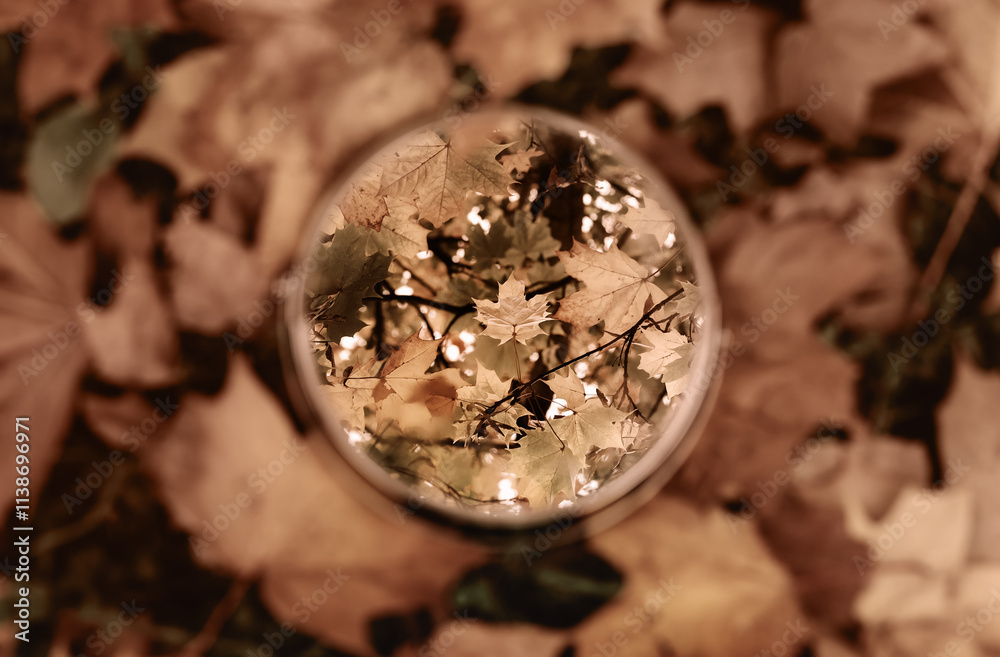 Natural background of autumn leaves and mirror. Mocha color mousse.