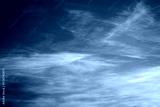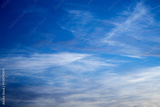 Blue sky with white feathery clouds at sunset, blue sky with white haze, soft focus, heavenly background.