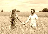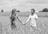 Beautiful couple with bouquet of flowers standing on spring meadow