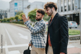 Two business people engaged in an animated discussion while walking in a city street, illustrating modern collaborative working practices and dynamic city life.